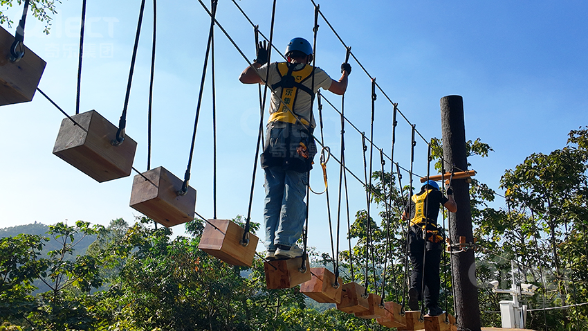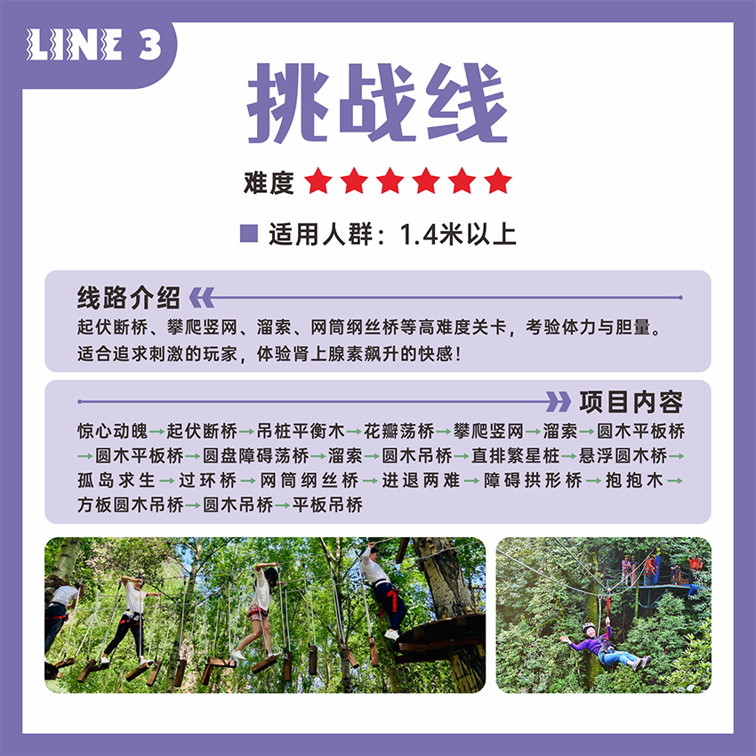专为勇敢者准备的进阶之路!挑战线拥有更高的平台、更长的滑索和更复杂的障碍组合,如连续高空吊桩、Z字形平衡木、溜索、进退两难等。每一步都在考验你的体力、耐力和心理素质。