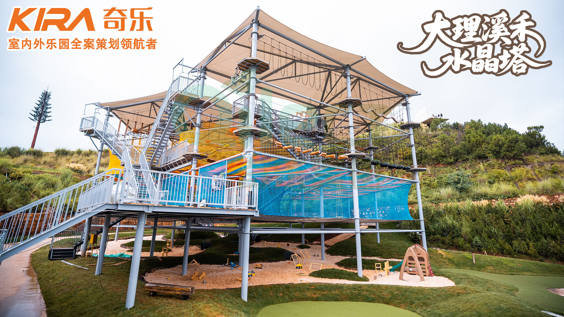在北京温榆河生态走廊的核心区域,一座由广州奇乐游乐设备有限公司设计建造的「阿尔法户外探险水晶塔」正以独特的几何美感重塑城市休闲版图。这座总高度29.8米、占地1100平方米的立体探险设施,不仅是奇乐模块化设计理念的集大成者,更通过军工级安全体系与智能监测技术,为都市人群开辟了全新的户外运动场景。