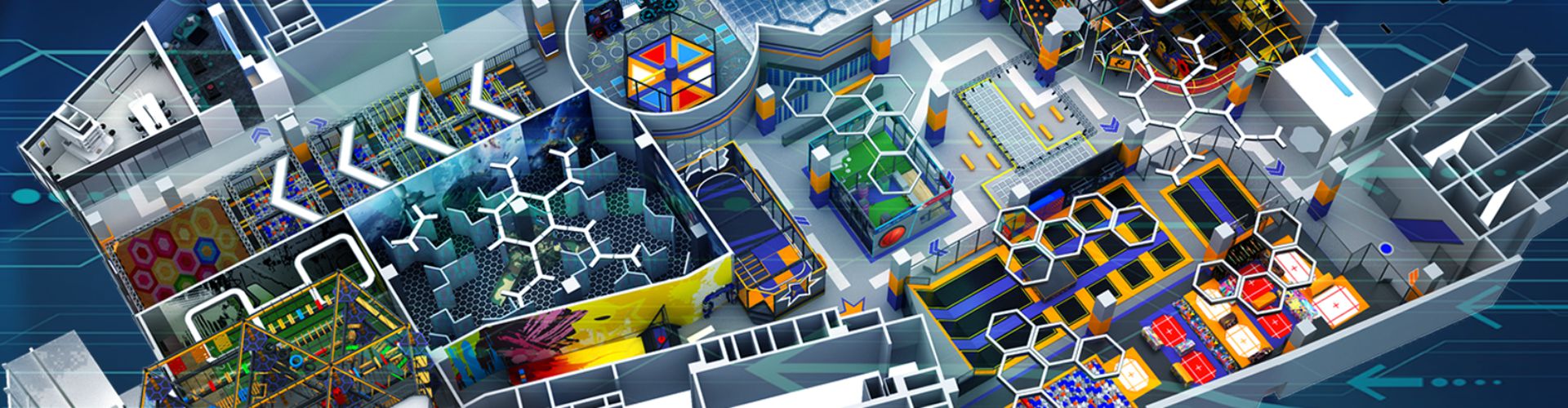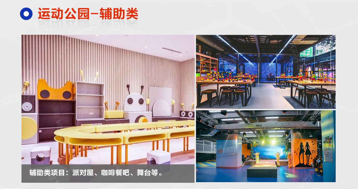 超级运动公园源自美国,以业态分布划分,可分为成人娱乐版块、儿童娱乐版块、潮流科技及辅助配套四大功能版块;以运动程度划分,可分为基本区、兴奋区、冒险区、数字科技区、辅助区。适合全年龄段玩家参与娱乐,打破年龄、性别、爱好等限制,为大众呈现一幅“快乐运动 有氧生活”的精彩运动娱乐公园。 高格调与国际接轨的优质项目,引领玩家突破常规的运动局限,体验全新的运动嘉年华:自由蹦床区、跑酷区、躲避球PK区、灌篮区、AIR BAG跳跃区、粘粘墙、背摔台、奥运蹦床区、海绵坑、忍者冲关、飞狐塔、滑索、弹跳迷宫、魔鬼滑梯、旱雪滑梯、拓展攀爬、创意攀岩、抱石攀岩、极限跳跃、天空漫步、梅花桩、冒险塔、科技互动类等三十余种项目。