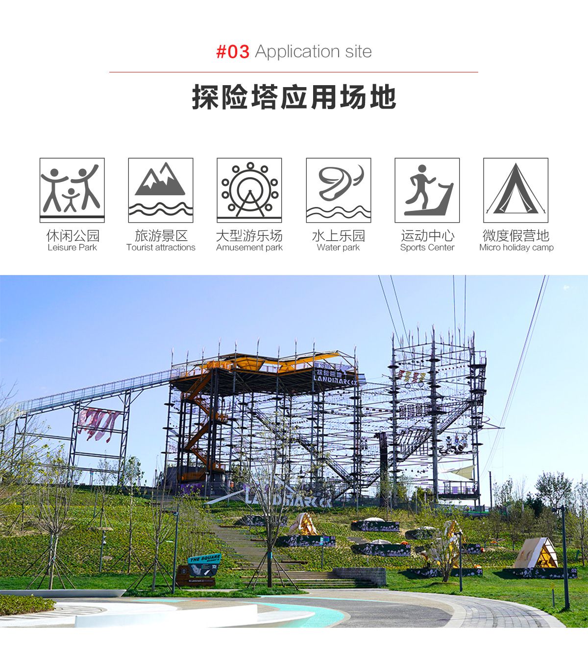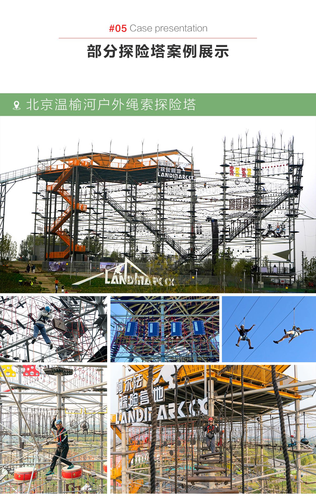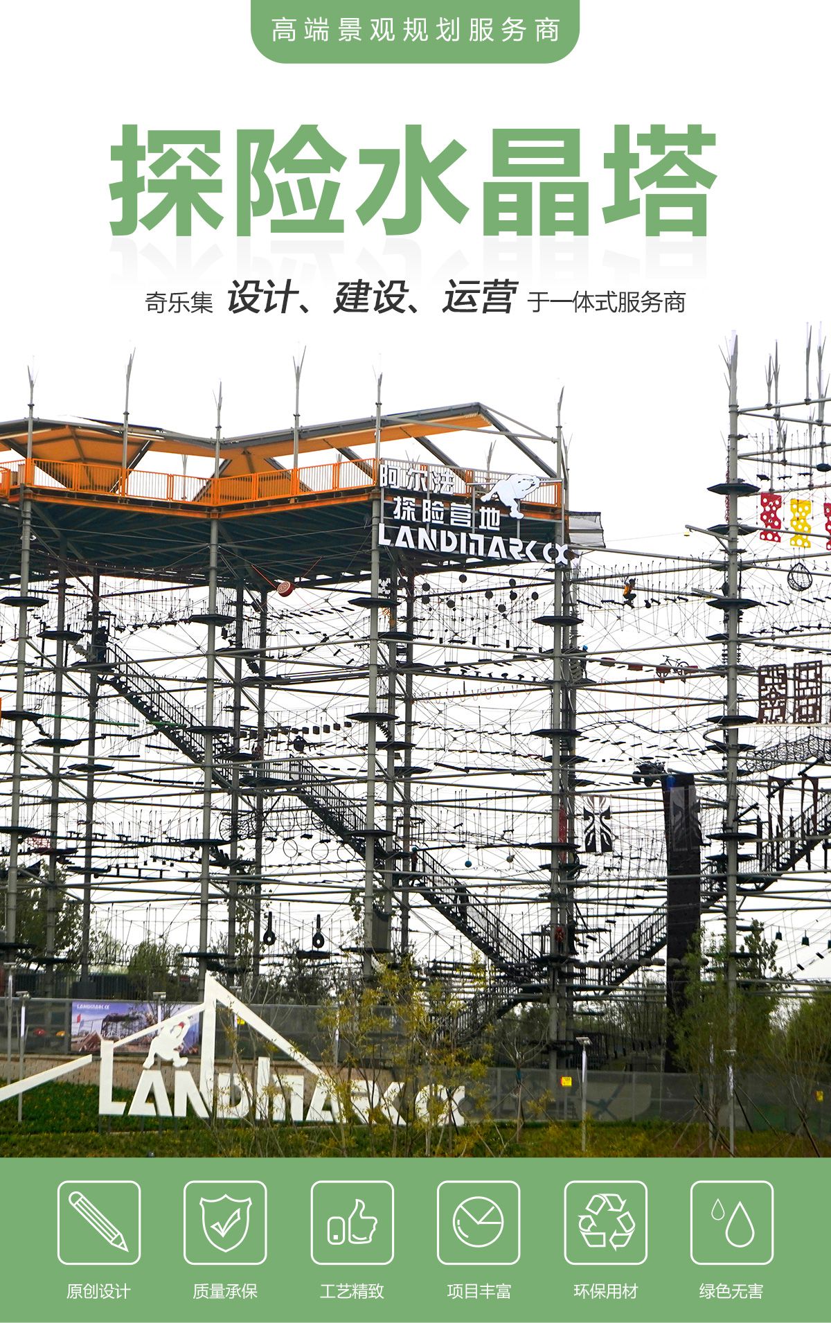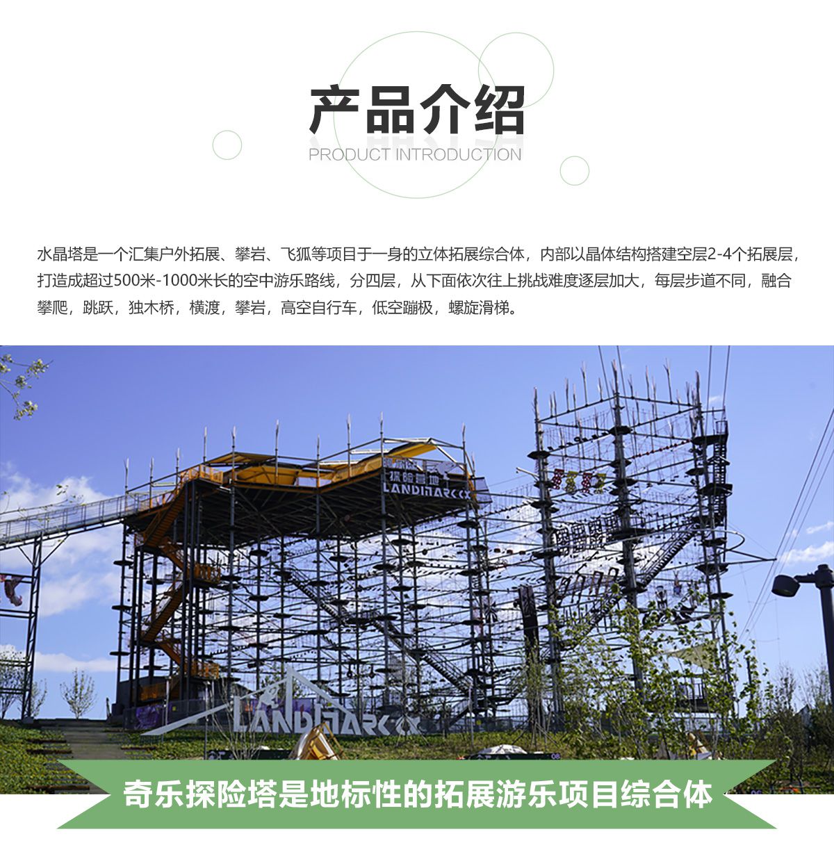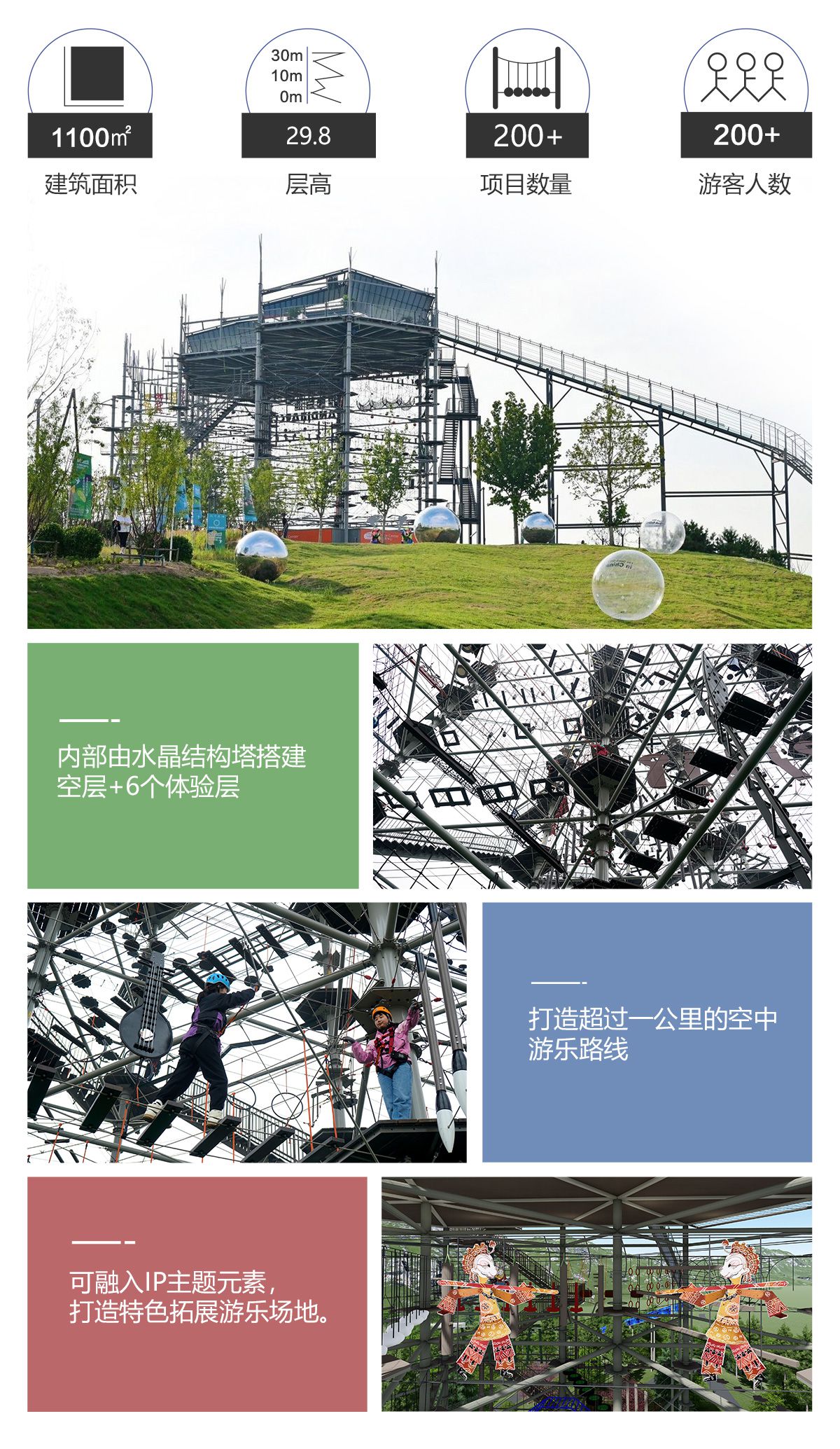 汇集 200 种游乐步道,适合广大游客 水晶塔集冒险、运动、娱乐、挑战于一体的综合游乐类项目,通过在塔内设置并搭建各种难易不同、风格迴异、超强刺激的步道关卡,让游客体验高空坠落与自由滑翔的快感,感受塔内项目攀爬穿越的刺激。水晶塔是一个创新且极具盈利能力的全新休闲旅游项目,适合建在户外,也可以建在窒内。 晶体结构,更稳固,更安全 水晶塔采用品体结构设计,每4根立柱为1个晶体结构,可根据客户需求自由组合,晶体结构设计更大的增加设备的稳定性、利用率,保证客户场地的实用率最大化,立柱之间做连杆支撑,根据结构设置观景台,可达 80~1000+m?,可作为餐饮,休闲吧,咖啡吧,酒吧等休闲休息区域,平台下方悬空架连接杆支撑,平台可同时承载 30-1000+人。 搭配我司自主研发生命系统,保障安全无死角自主研发自锁式双挂钩,相互交替型安全保障永远保证有一个挂钩自锁在钢丝绳上面,保障安全无死角。