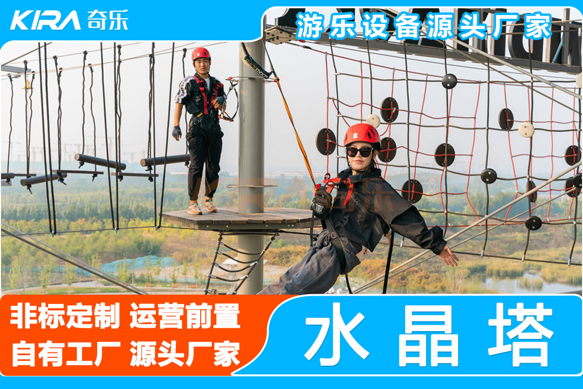 在北京温榆河生态走廊的核心区域,一座由广州奇乐游乐设备有限公司设计建造的「阿尔法户外探险水晶塔」正以独特的几何美感重塑城市休闲版图。这座总高度29.8米、占地1100平方米的立体探险设施,不仅是奇乐模块化设计理念的集大成者,更通过军工级安全体系与智能监测技术,为都市人群开辟了全新的户外运动场景。