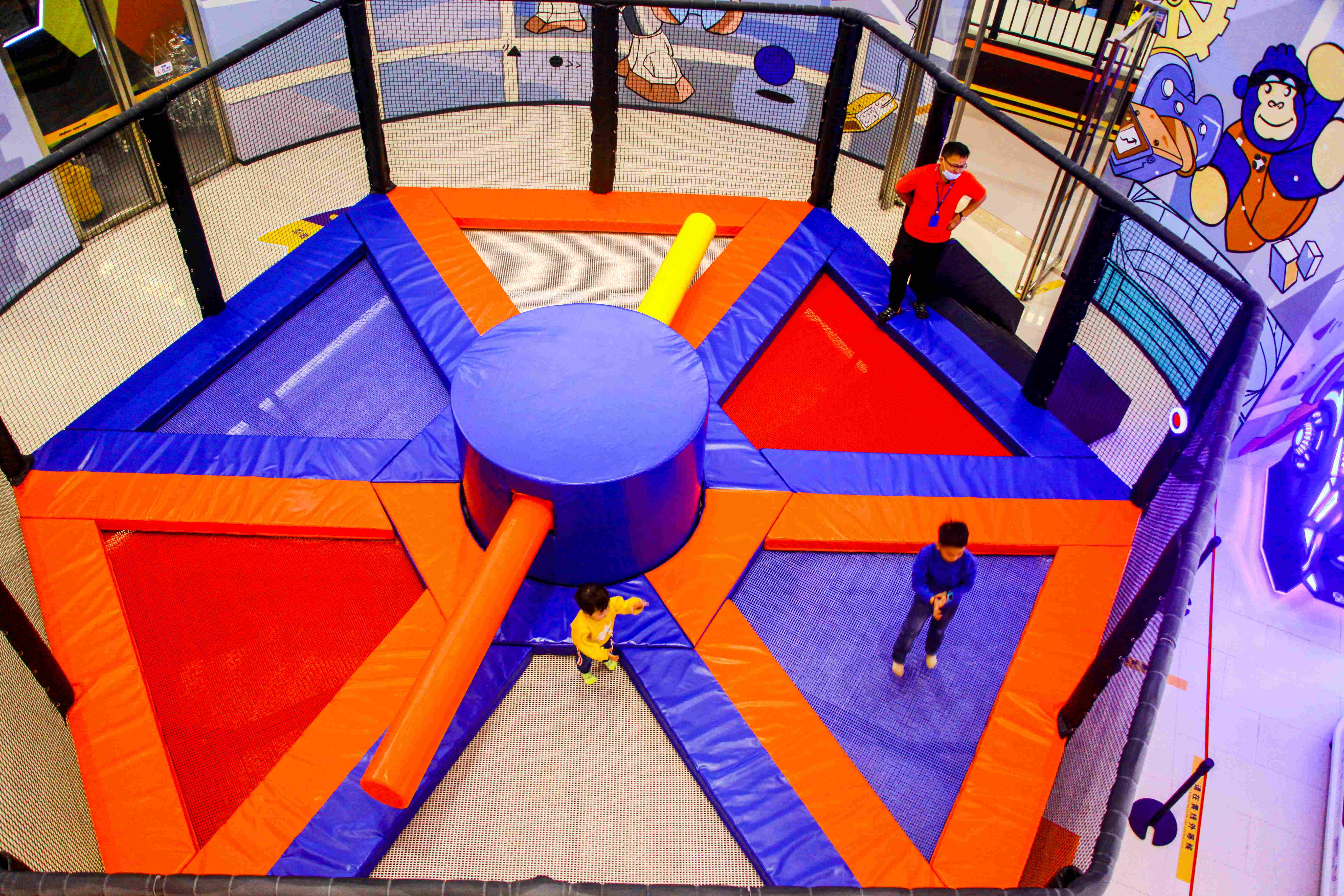 核心地标(180㎡):星际母舰探索基地。一座充满机械感和灯光元素的淘气堡定制结构,集成指挥台滑梯、管道逃生舱、光电操控面板。