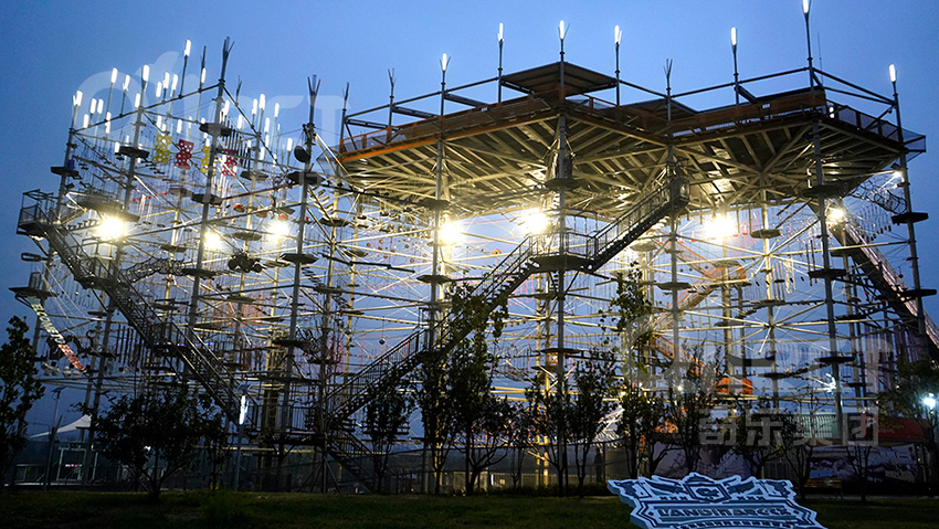 在北京温榆河生态走廊的核心区域,一座由广州奇乐游乐设备有限公司设计建造的「阿尔法户外探险水晶塔」正以独特的几何美感重塑城市休闲版图。这座总高度29.8米、占地1100平方米的立体探险设施,不仅是奇乐模块化设计理念的集大成者,更通过军工级安全体系与智能监测技术,为都市人群开辟了全新的户外运动场景。