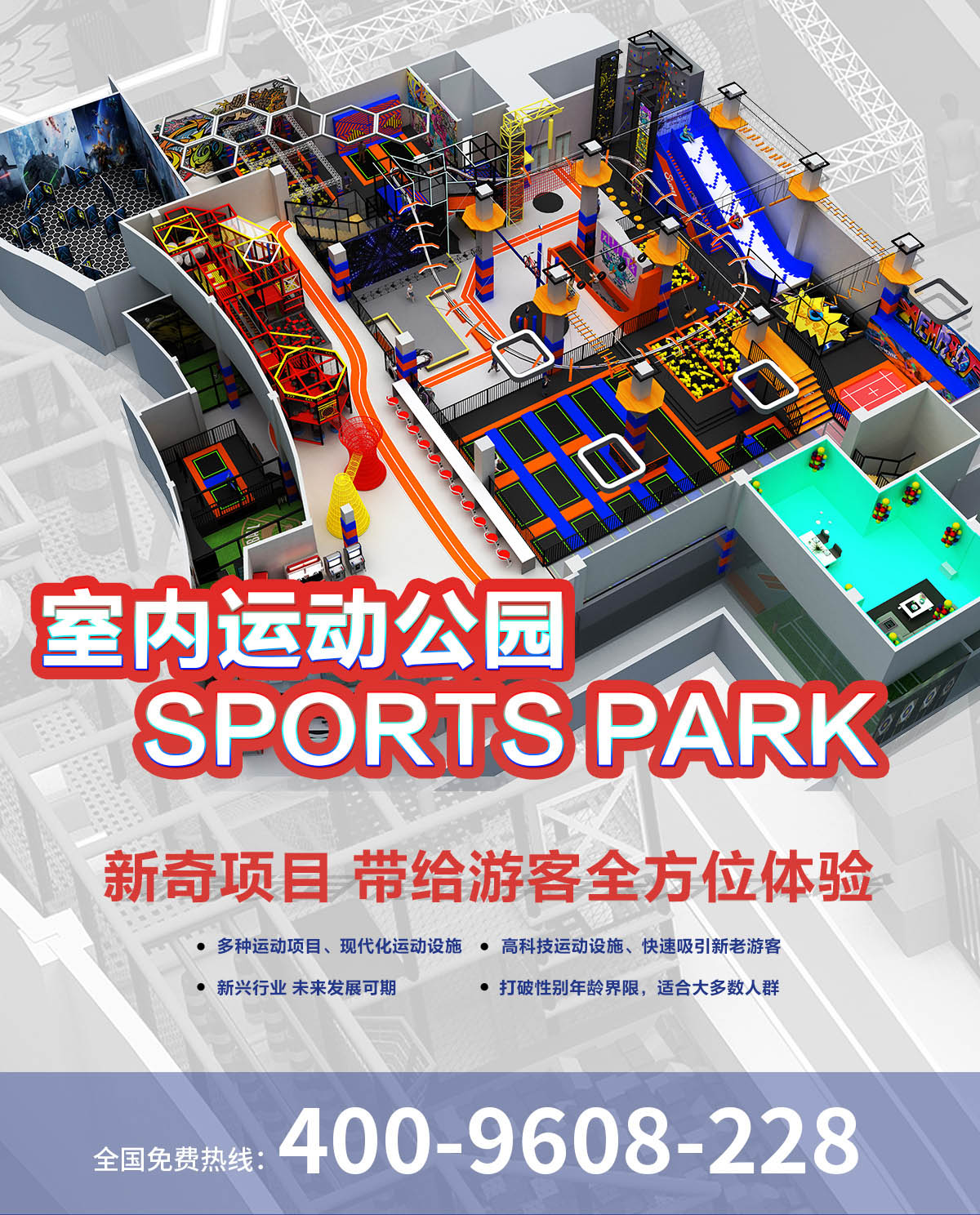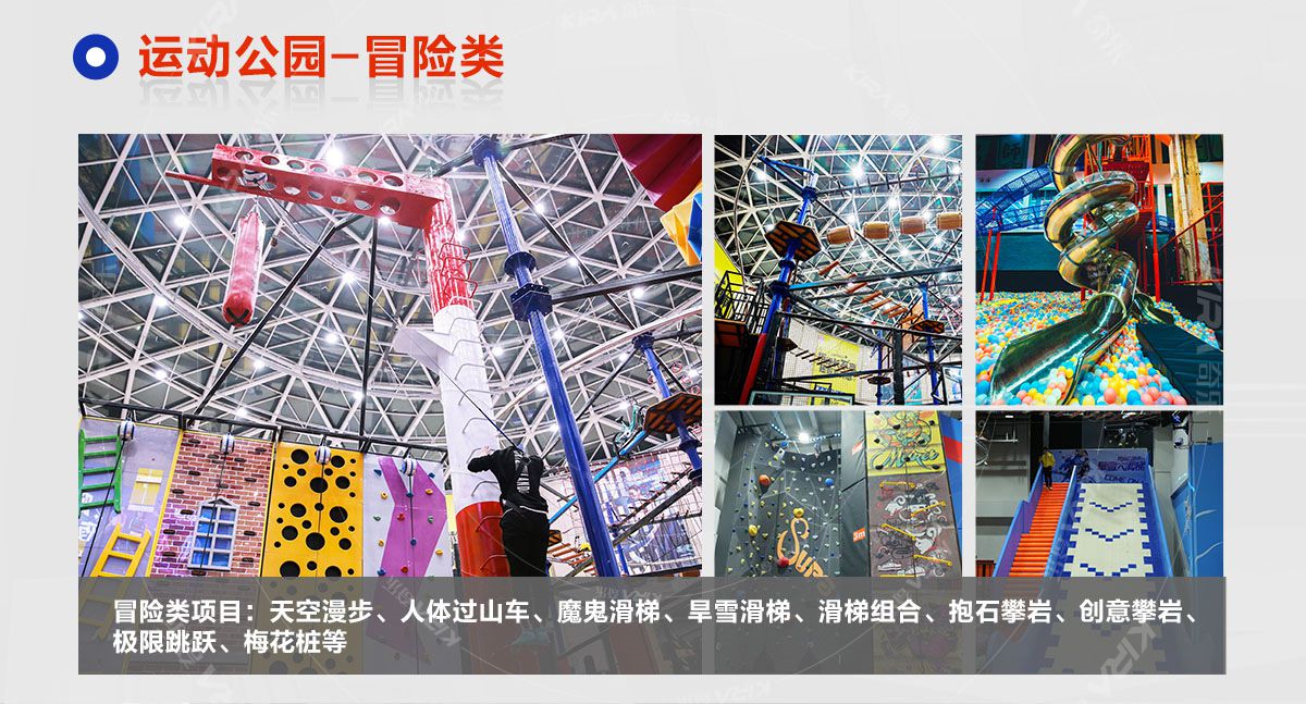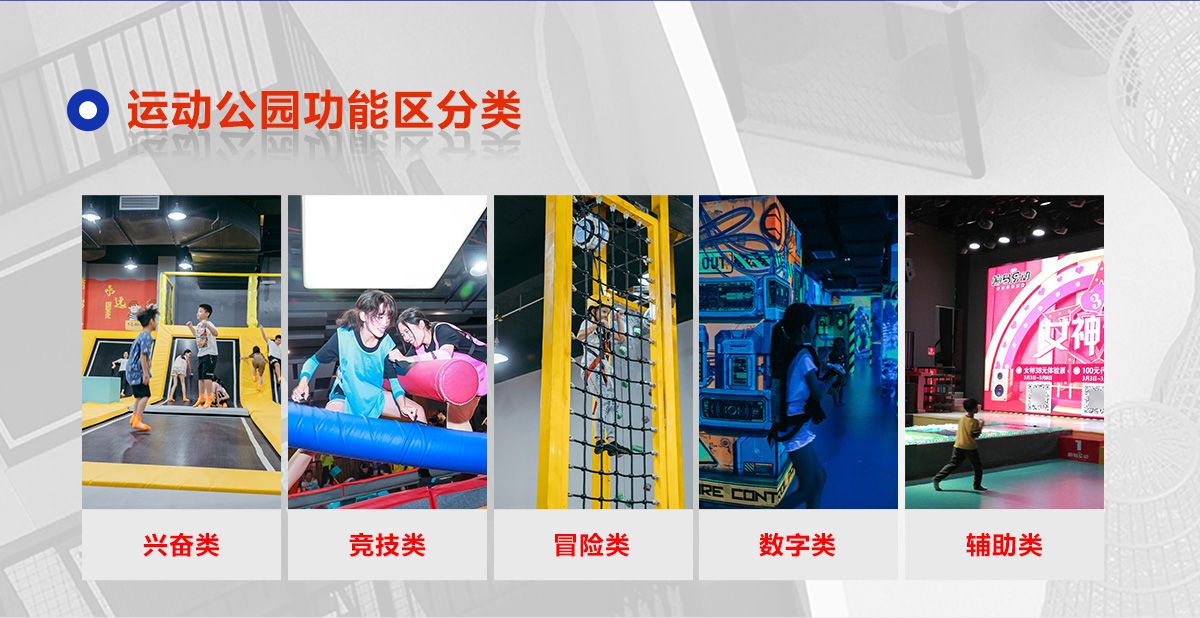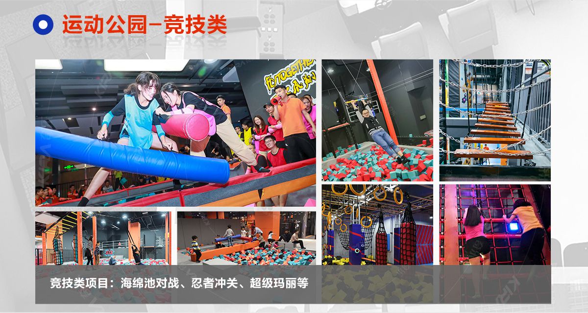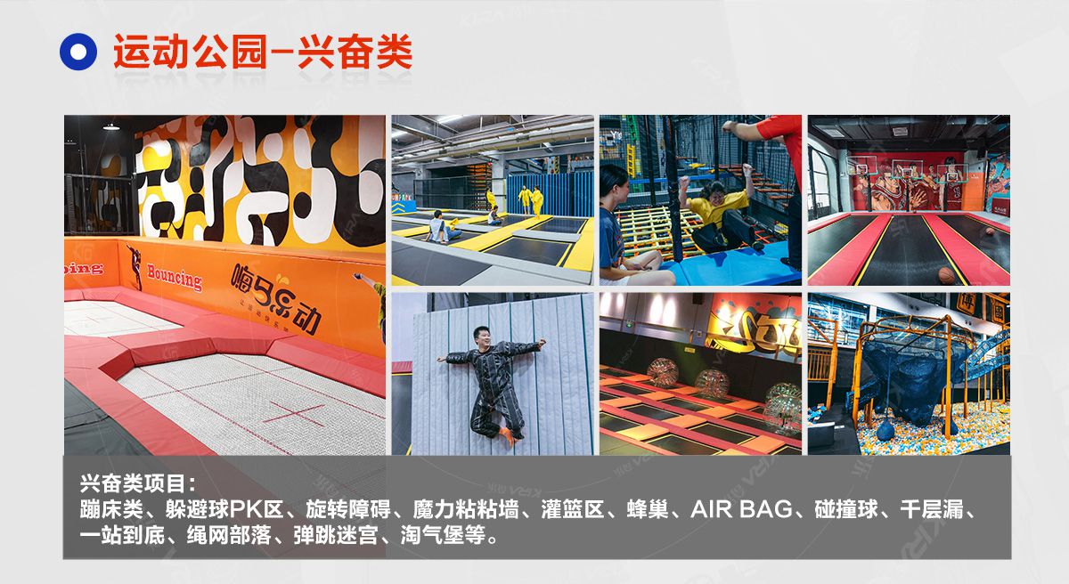 超级运动公园源自美国,以业态分布划分,可分为成人娱乐版块、儿童娱乐版块、潮流科技及辅助配套四大功能版块;以运动程度划分,可分为基本区、兴奋区、冒险区、数字科技区、辅助区。适合全年龄段玩家参与娱乐,打破年龄、性别、爱好等限制,为大众呈现一幅“快乐运动 有氧生活”的精彩运动娱乐公园。 高格调与国际接轨的优质项目,引领玩家突破常规的运动局限,体验全新的运动嘉年华:自由蹦床区、跑酷区、躲避球PK区、灌篮区、AIR BAG跳跃区、粘粘墙、背摔台、奥运蹦床区、海绵坑、忍者冲关、飞狐塔、滑索、弹跳迷宫、魔鬼滑梯、旱雪滑梯、拓展攀爬、创意攀岩、抱石攀岩、极限跳跃、天空漫步、梅花桩、冒险塔、科技互动类等三十余种项目。