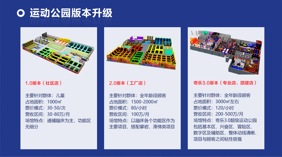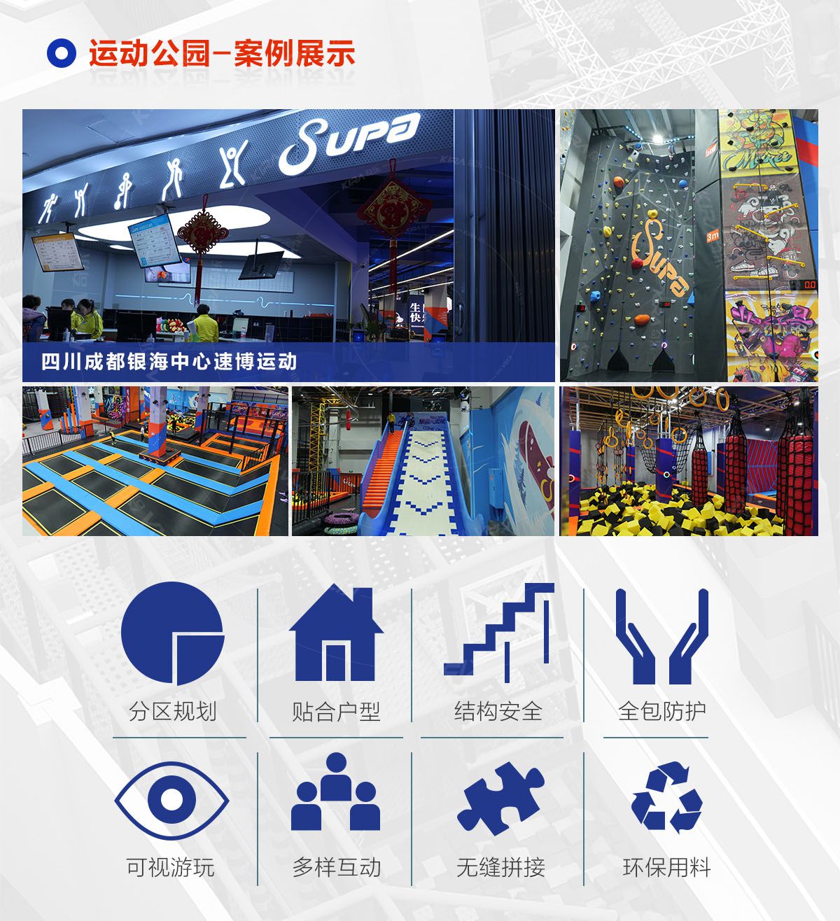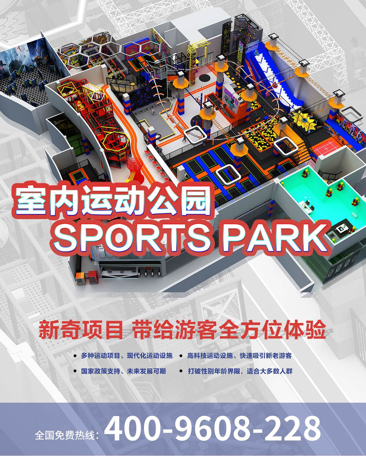 超级运动公园源自美国,以业态分布划分,可分为成人娱乐版块、儿童娱乐版块、潮流科技及辅助配套四大功能版块;以运动程度划分,可分为基本区、兴奋区、冒险区、数字科技区、辅助区。适合全年龄段玩家参与娱乐,打破年龄、性别、爱好等限制,为大众呈现一幅“快乐运动 有氧生活”的精彩运动娱乐公园。 高格调与国际接轨的优质项目,引领玩家突破常规的运动局限,体验全新的运动嘉年华:自由蹦床区、跑酷区、躲避球PK区、灌篮区、AIR BAG跳跃区、粘粘墙、背摔台、奥运蹦床区、海绵坑、忍者冲关、飞狐塔、滑索、弹跳迷宫、魔鬼滑梯、旱雪滑梯、拓展攀爬、创意攀岩、抱石攀岩、极限跳跃、天空漫步、梅花桩、冒险塔、科技互动类等三十余种项目。